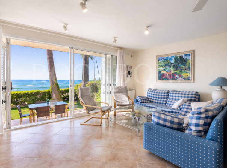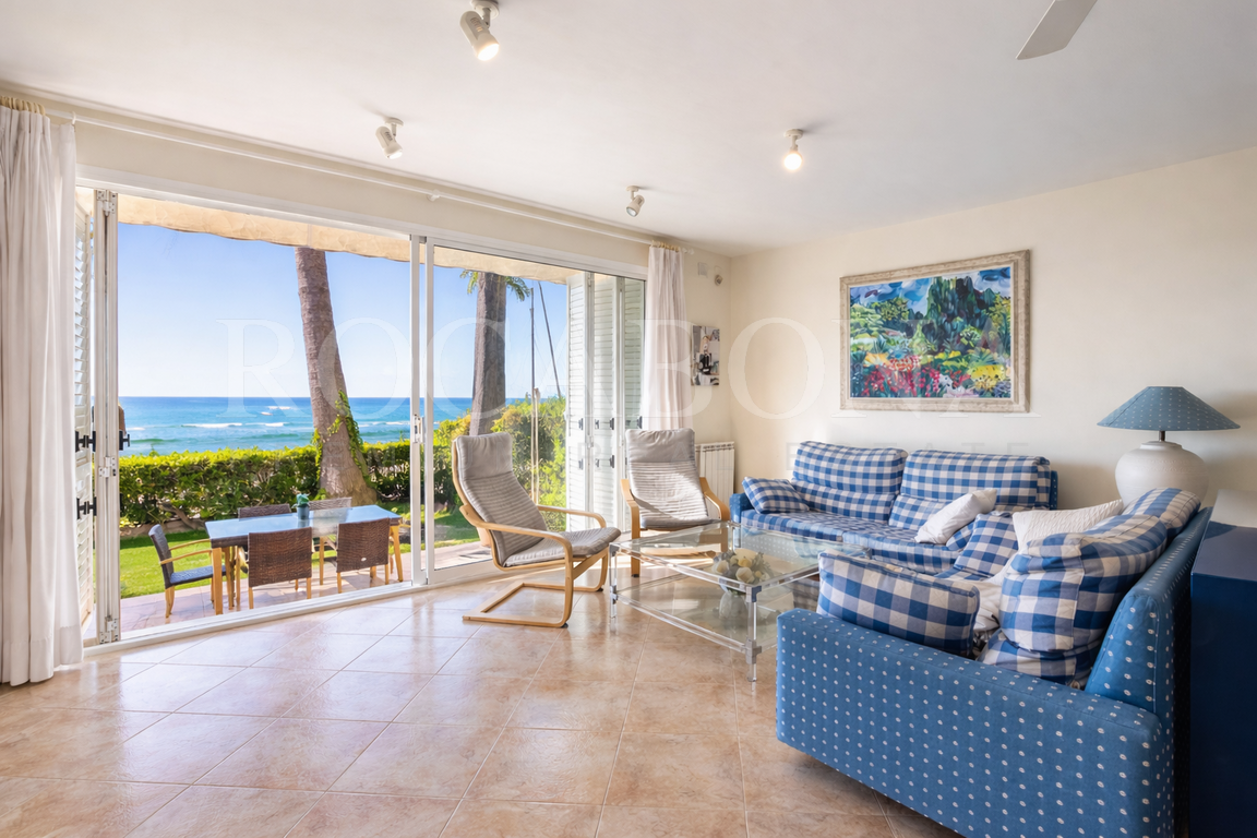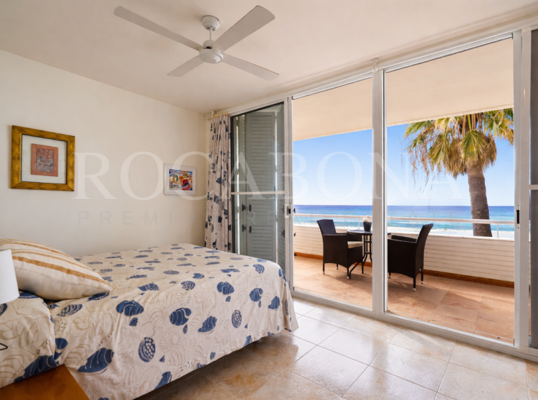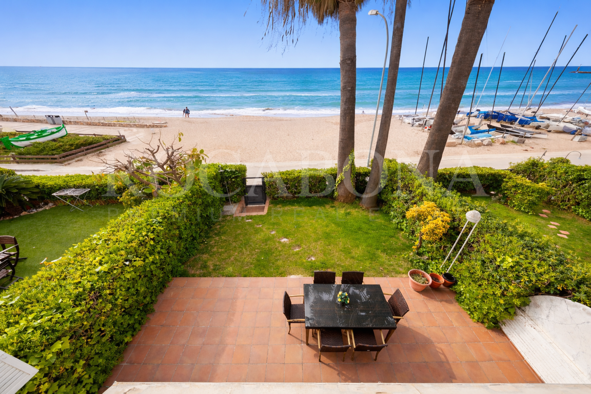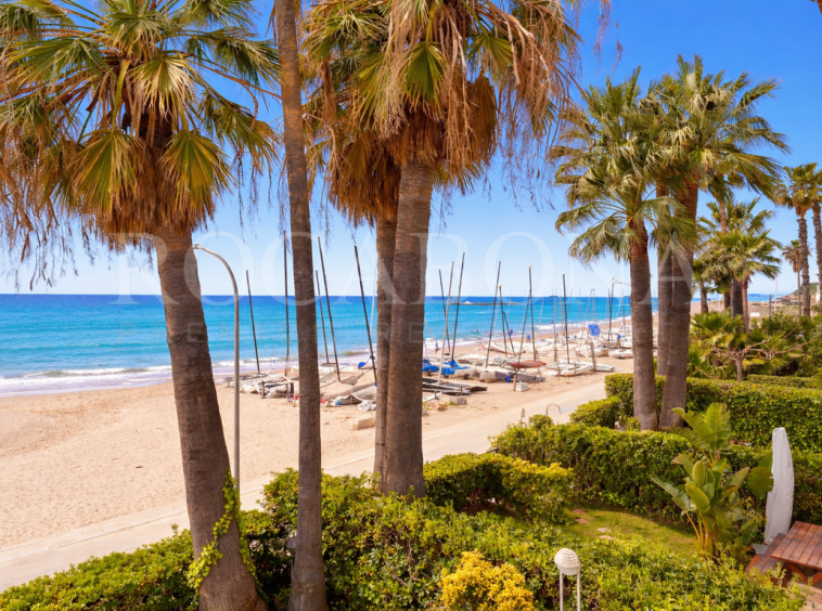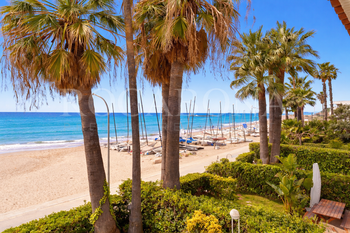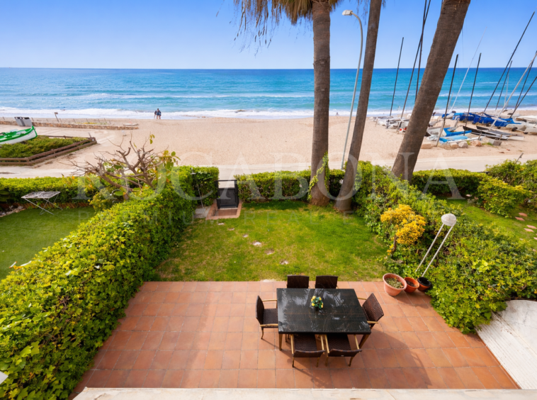 En el exterior, la propiedad dispone de dos jardines privativos: uno frontal, con acceso directo al mar, y otro posterior, más íntimo y conectado con la urbanización privada.