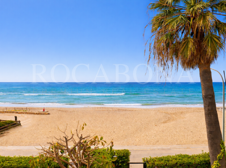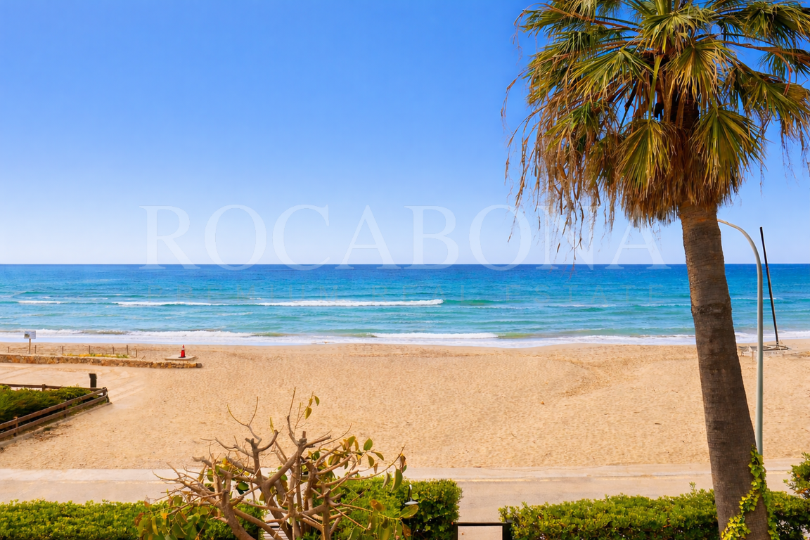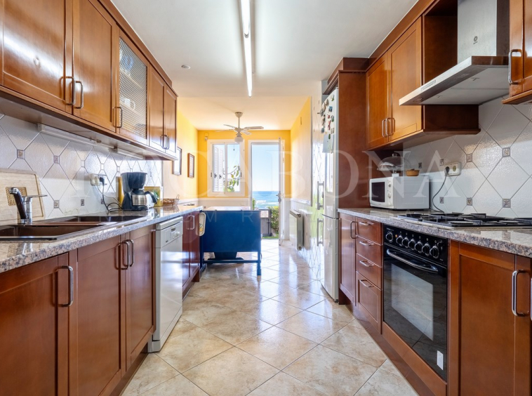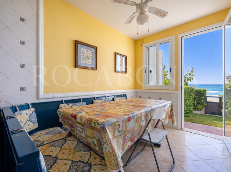La planta principal alberga un elegante salón-comedor bañado por luz natural, con vistas abiertas al mar y salida directa al jardín frontal, desde donde se accede directamente a la playa. La cocina, totalmente equipada y con zona office, también conecta con el exterior. En esta planta encontramos además dos dormitorios dobles y un baño completo con bañera, así como acceso al jardín posterior con salida a la urbanización.