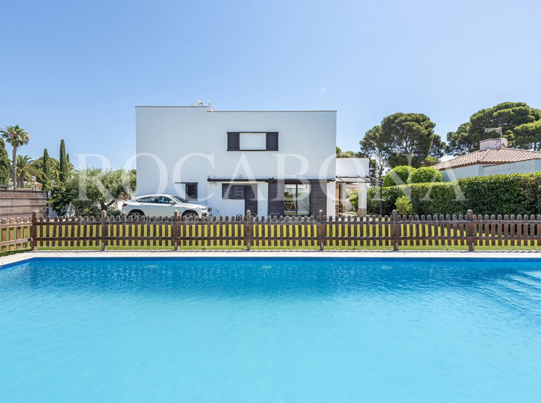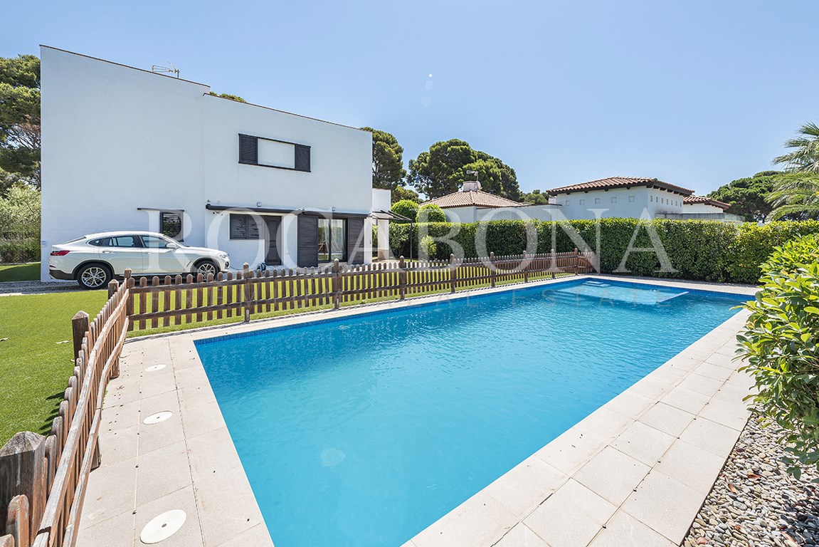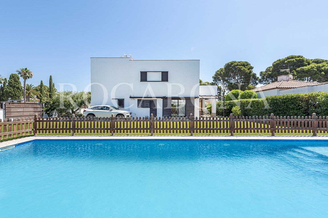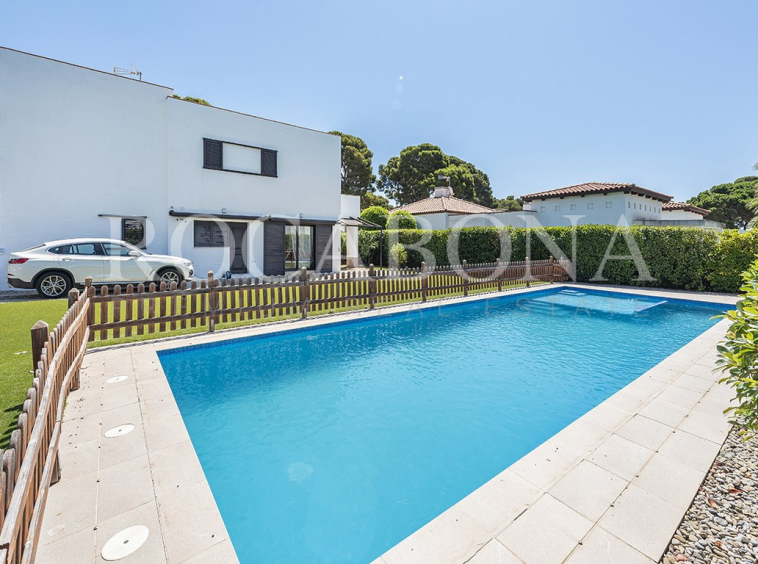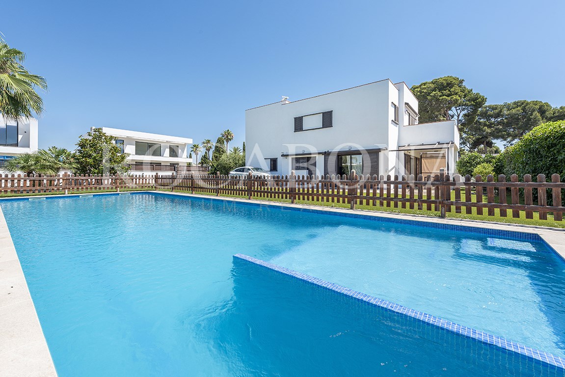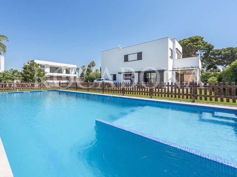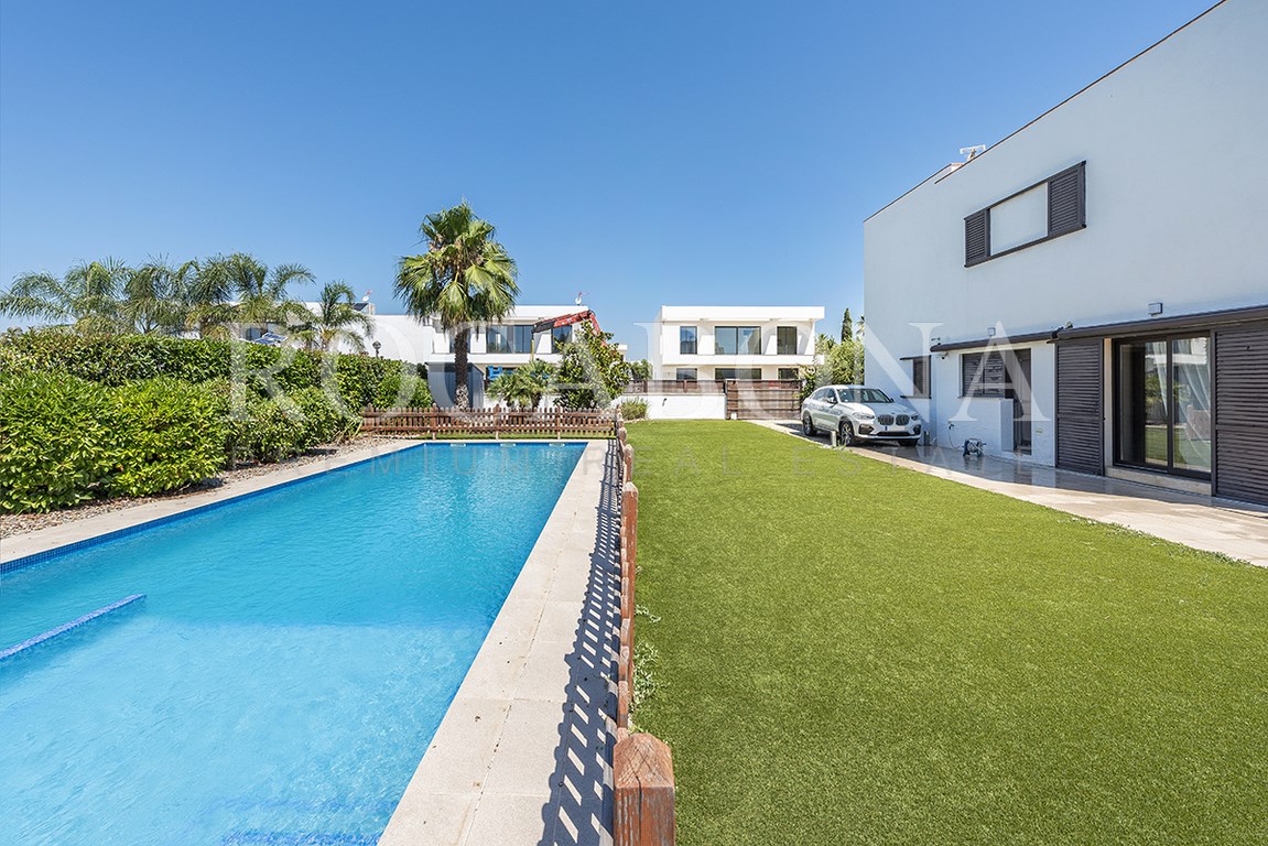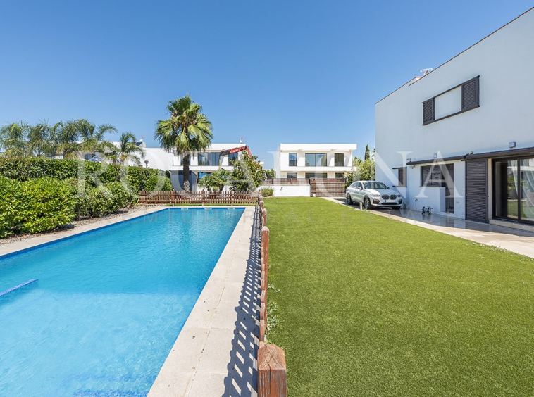 El exterior de la vivienda es un verdadero oasis: un exuberante jardín perfectamente cuidado, una amplia terraza equipada y una espectacular piscina privada, perfecta para disfrutar del clima soleado durante todo el año. La propiedad también dispone de un espacioso aparcamiento con capacidad para varios vehículos.