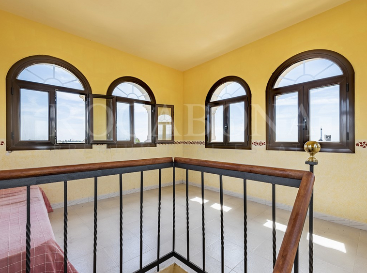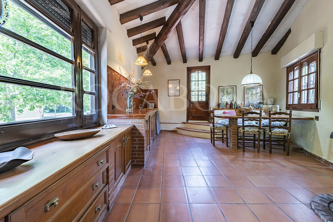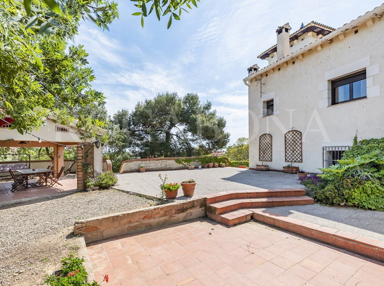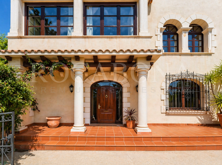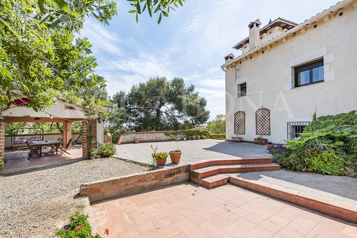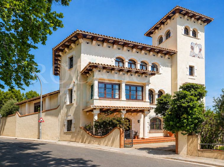 La vivienda, distribuida en planta baja y dos alturas, evoca las antiguas masías catalanas con una cuidada galería de arcos rebajados y una elegante torre cuadrada que corona la propiedad. En ella, sobresale un espectacular mosaico de San Antonio junto a un reloj de sol, símbolos de tradición y distinción. Los aleros, decorados con azulejos de inspiración renacentista procedentes de Sevilla y Valencia, aportan un carácter artístico absolutamente singular.