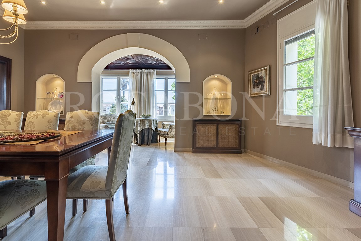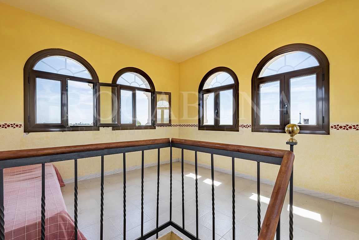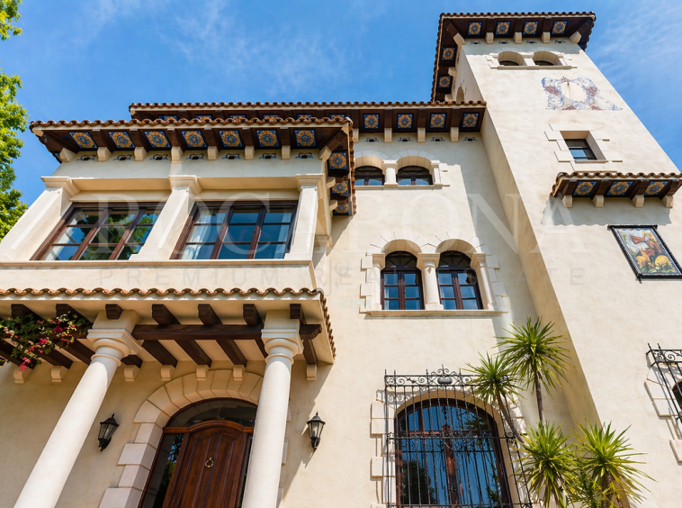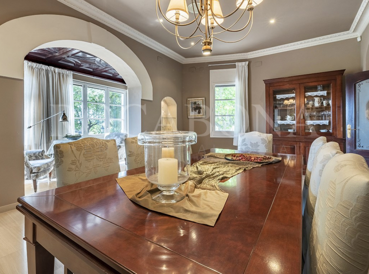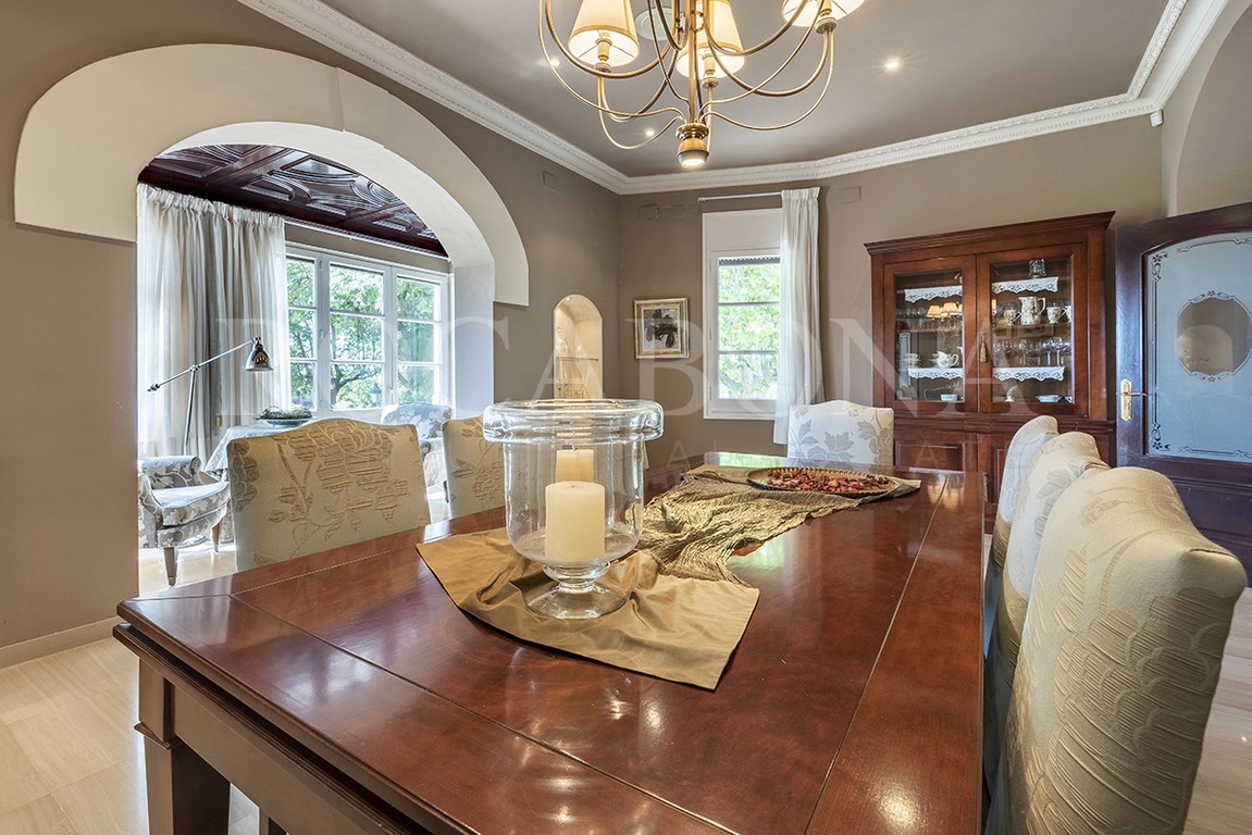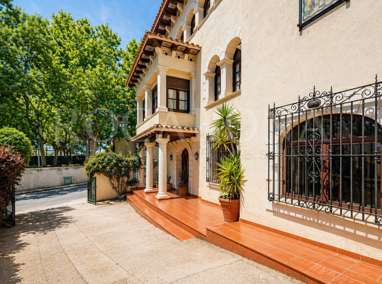 La vivienda, distribuida en planta baja y dos alturas, evoca las antiguas masías catalanas con una cuidada galería de arcos rebajados y una elegante torre cuadrada que corona la propiedad. En ella, sobresale un espectacular mosaico de San Antonio junto a un reloj de sol, símbolos de tradición y distinción. Los aleros, decorados con azulejos de inspiración renacentista procedentes de Sevilla y Valencia, aportan un carácter artístico absolutamente singular.